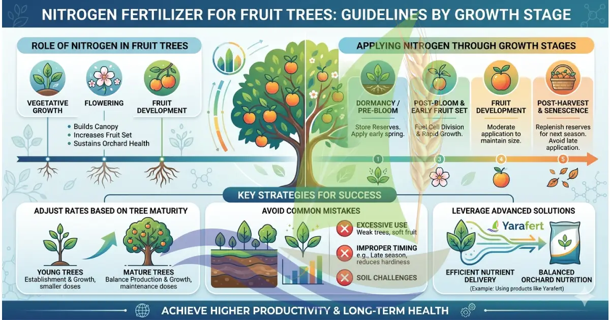 This comprehensive guide explains how to apply nitrogen fertilizer throughout the life cycle of fruit trees, how to adjust rates based on tree maturity, and how to avoid common mistakes. It also highlights how advanced solutions such as Yarafert products support efficient nutrient delivery and balanced orchard nutrition.